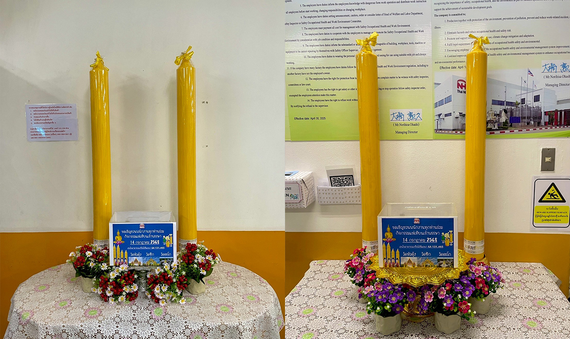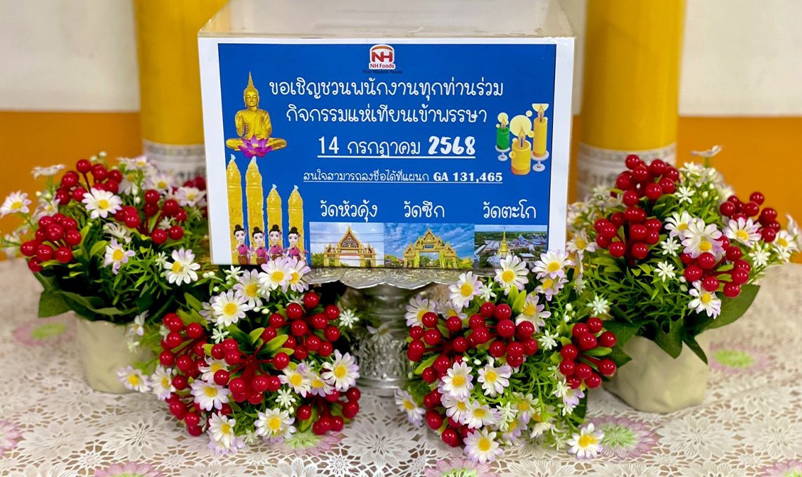 On Monday, July 14, 2025, Thai Nippon Foods Co., Ltd. organized its annual CSR candle offering activity for the Buddhist Lent. The purpose of this event was to help preserve Thai culture and traditions, as well as to strengthen the relationship between employees and the local community through a meaningful and respectful cultural activity.