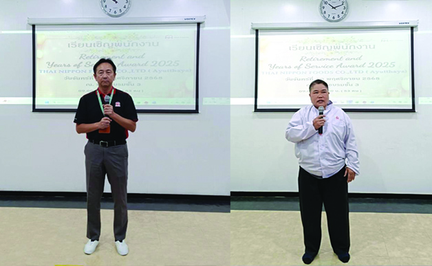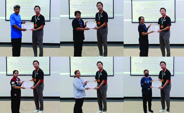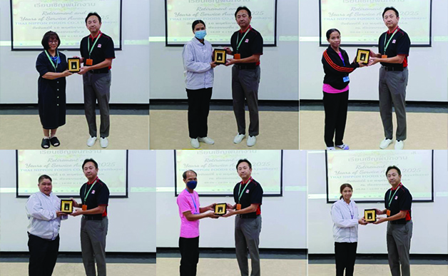 During the ceremony, executives extended congratulations and heartfelt thanks to all employees for their contributions to the company’s success. Souvenirs were presented to retirees and employees who have completed 10 and 20 years of service—reflecting the strong bond and pride of being part of the Thai Nippon Foods family.