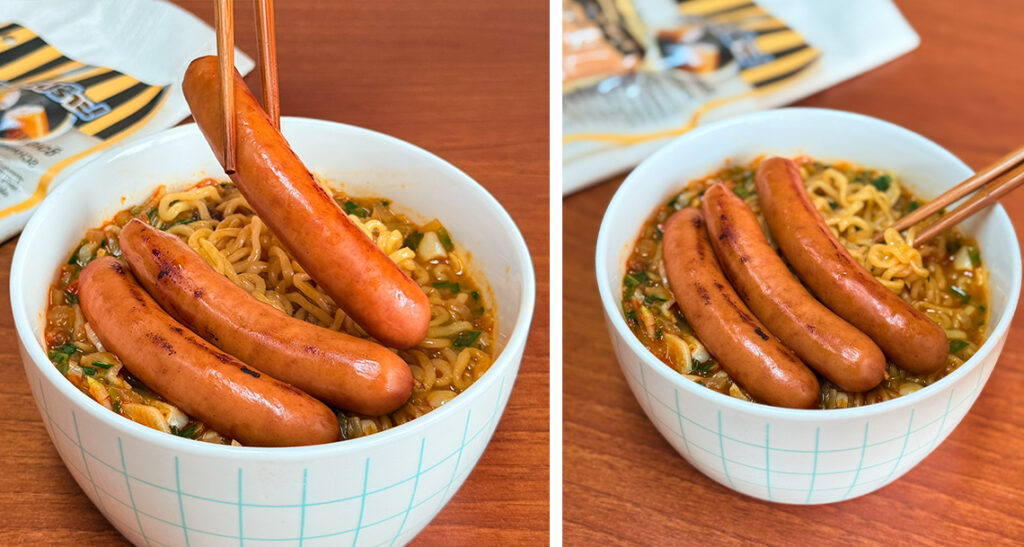 รามยอนเส้นเหนียวนุ่ม ในน้ำซุปสไตล์เกาหลี ท็อปด้วยไส้กรอก SCHAU ESSEN คุณภาพจาก NH Foods อร่อย ทำง่าย อิ่มครบในชามเดียว